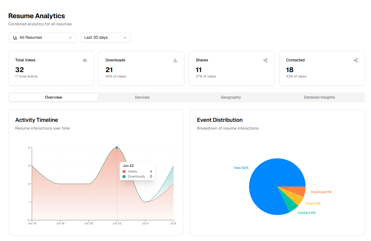 Store your resumes, get AI feedback, track performance with analytics, and build a professional portfolio website.